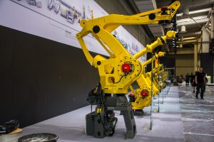 Den letzten Schwerpunkt bilden die Roboter.Am ersten Tag habe ich allerdings nur kollaborative Roboter gesehen. Ein alter Hut. Dennoch hat mich bei dem japanischen Roboterhersteller Fanuc der „Aufmarsch“ der „gelben Teufel in Halle 17 durchaus beeindruckt.