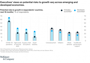 Bei der Frage nach allen potenziellen Wachstumsrisiken, die die Führungskräfte vorhersehen, sind einige regionale Unterschiede bemerkenswert (Abb. 3). Die Befragten in den Industrieländern nannten mit höherer Wahrscheinlichkeit die Pandemie (65 Prozent gegenüber 55 Prozent) sowie Vermögensblasen, hohe Staatsverschuldung und Unterbrechungen der Lieferkette. Gleichzeitig stehen in den Schwellenländern Sorgen über unzureichende staatliche Unterstützung, Arbeitslosigkeit, Inflation und Nachfrageschwäche höher im Kurs.