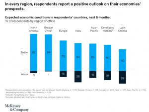 Das wohl überraschendste Ergebnis der McKinsey Global Survey ist dies: Global gesehen glauben 73 Prozent aller Befragten, dass sich die Bedingungen für die Weltwirtschaft in den nächsten sechs Monaten verbessern werden.